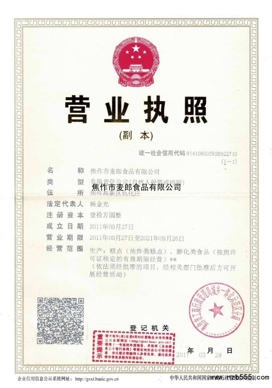 | 發(fā)證機(jī)構(gòu): | 焦作市工商行政管理局城鄉(xiāng)一體化示范區(qū)分局 | 發(fā)證時(shí)間 : | 2017-03-28 |