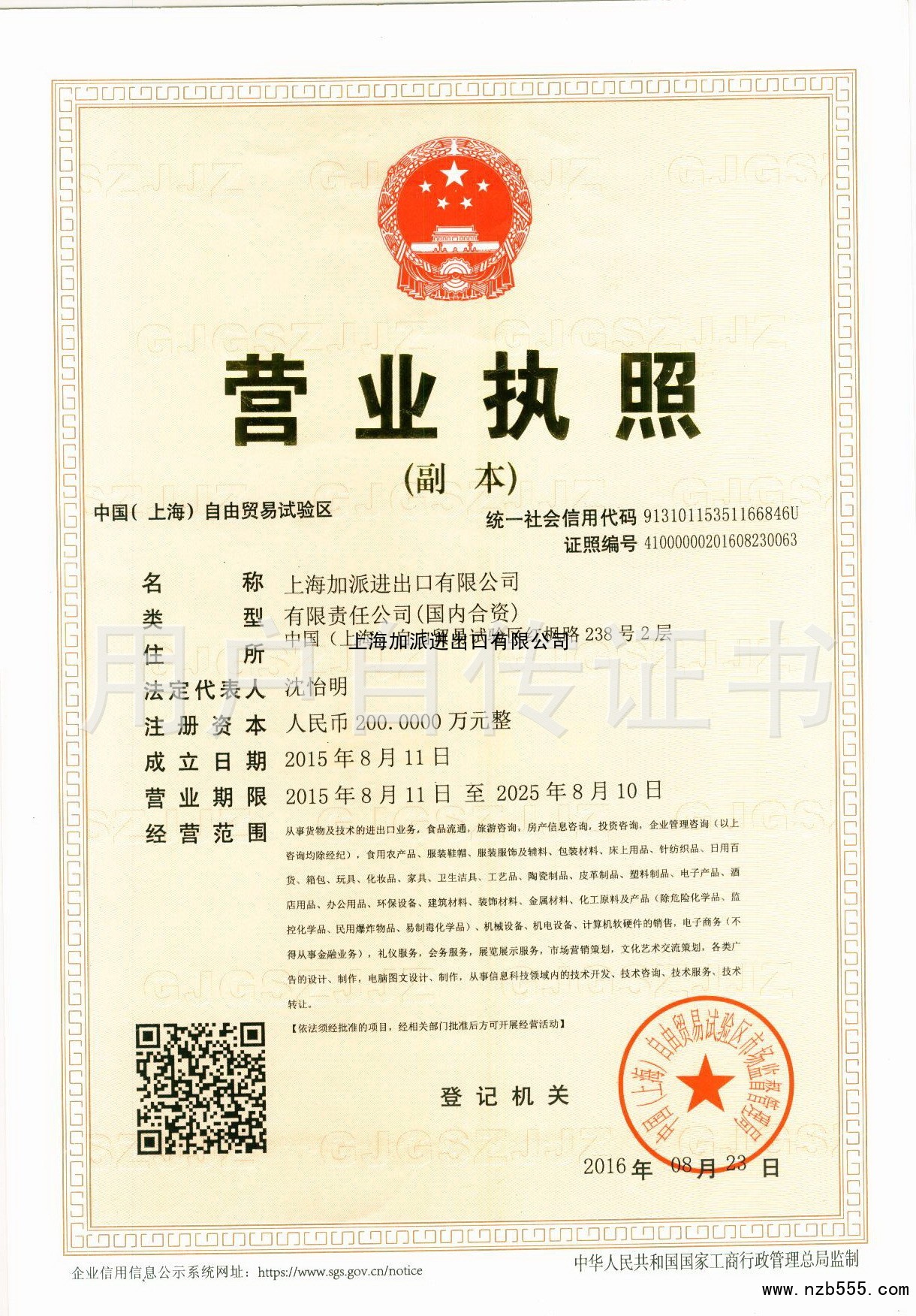 | 發(fā)證機(jī)構(gòu): | 中國(guó)(上海)自由貿(mào)易試驗(yàn)區(qū)市場(chǎng)監(jiān)督管理局 | 發(fā)證時(shí)間 : | 2016-08-23 |