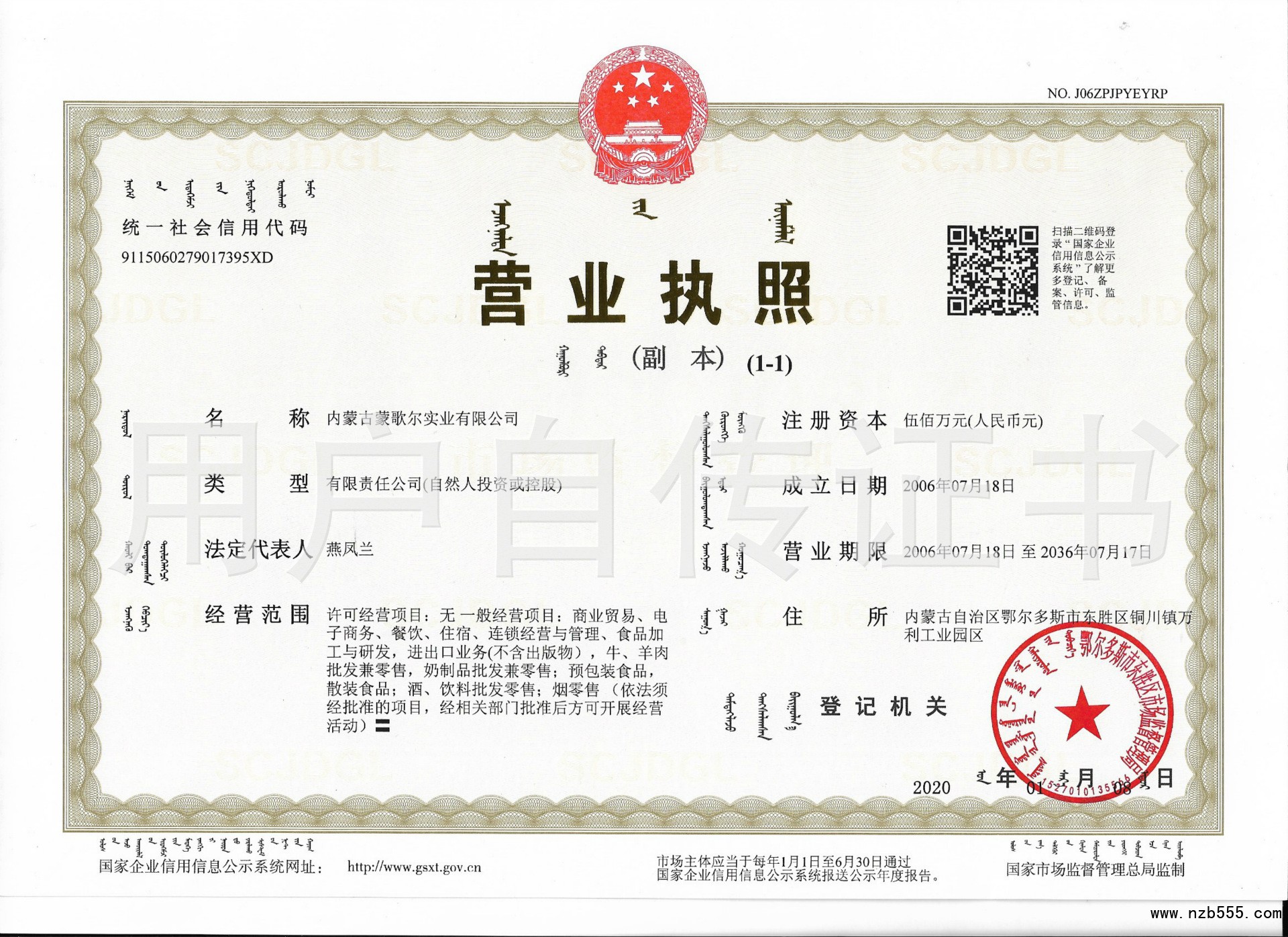 | 發(fā)證機(jī)構(gòu): | 鄂爾多斯市東勝區(qū)市場監(jiān)督管理局 | 發(fā)證時間 : | 2020-01-08 |