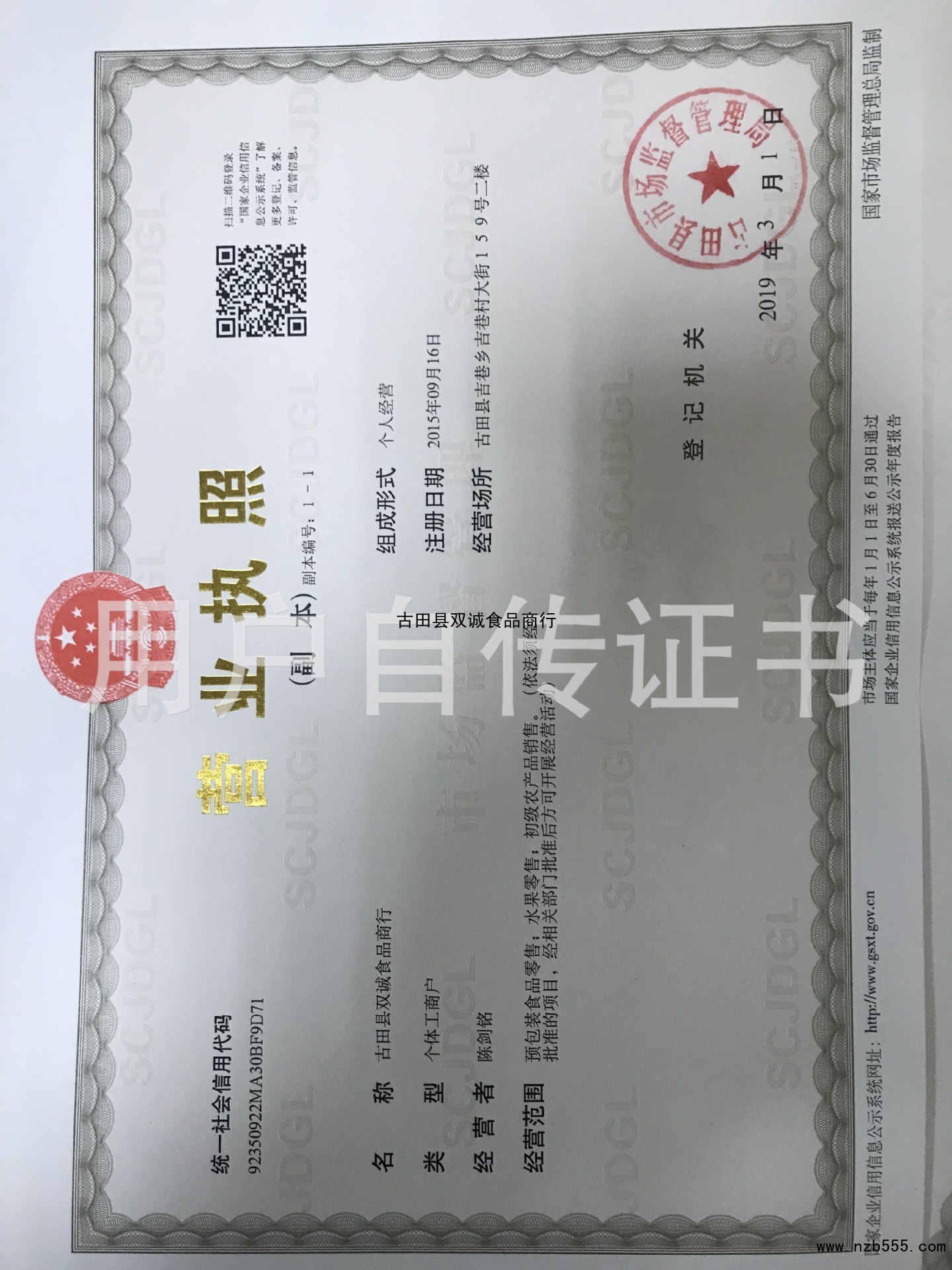 | 發(fā)證機(jī)構(gòu): | 古田縣市場監(jiān)督管理局 | 發(fā)證時(shí)間 : | 2019-03-01 |