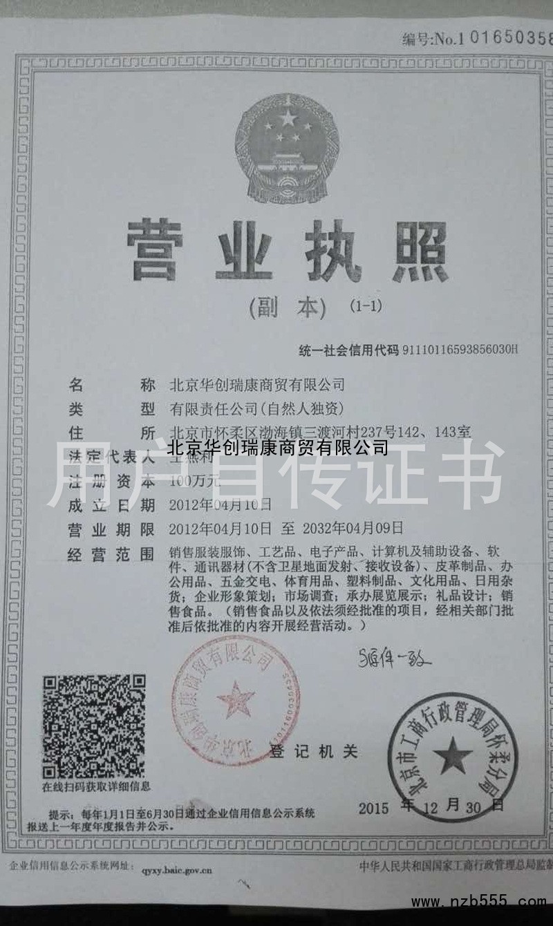 | 發(fā)證機(jī)構(gòu): | 北京市工商行政管理局懷柔分局 | 發(fā)證時間 : | 2015-12-30 |