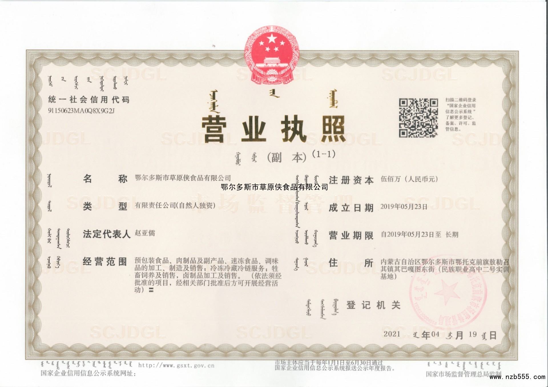 | 發(fā)證機(jī)構(gòu): | 鄂托克前旗市場監(jiān)督管理局 | 發(fā)證時(shí)間 : | 2021-04-19 |