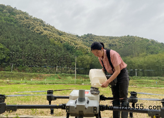 黎穎鈞正在給植保無(wú)人機(jī)補(bǔ)充藥液。(受訪(fǎng)者供圖)