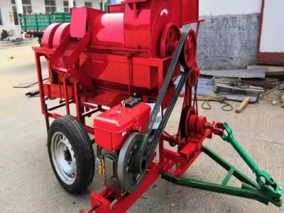 本機有進料斗,滾筒,凹板,架子等組成。工作時撞,將作物來連續(xù)均勻的喂入,作物有滾筒上紋稈于凹板組件的 摩擦,擠壓,碰,抖動使粒子從莖稈上分離,從凹版上流出,莖桿有滾 筒的離心作物射出去,完成脫粒。該機主要有喂入臺、機架、凹板篩、滾筒、機蓋、主風(fēng)機、吹風(fēng)機、電 動機或(柴油機)、振動篩、牽引導(dǎo)向裝置組成為提高籽粒的清潔度,SL-TL-(125 100 75 60 50 40)型脫粒機設(shè) 計二次清選風(fēng)機,并設(shè)有二次清選風(fēng)機,麥糠、雜物都可通過風(fēng)機排出機器外,麥粒落入振動篩底滑板后,從出糧口流出,人工 裝袋。并有兩種機型,一種為電機作為動力,另一種是以柴油機為動力,因此用戶在購買脫粒機時要根據(jù)自己的動力配備情況選購。 圣魯脫粒機,設(shè)計先進、結(jié)構(gòu)緊湊、選用優(yōu)質(zhì)結(jié)構(gòu)鋼材。該機采用軸流 式滾筒脫粒技術(shù)和可調(diào)風(fēng)量清選技術(shù),對谷粒、谷糠、谷秕、谷草的清選分離,具有分離清、損失小、脫凈率高的優(yōu) 點,是科學(xué)院所研究實驗谷子的理想機具,是農(nóng)民 脫粒的好幫手。